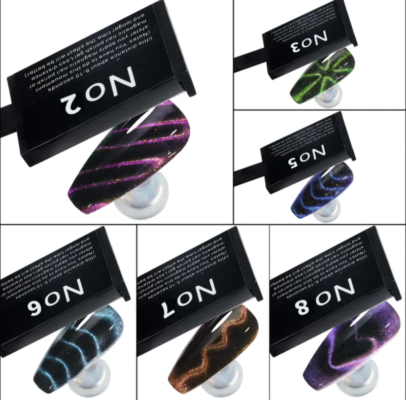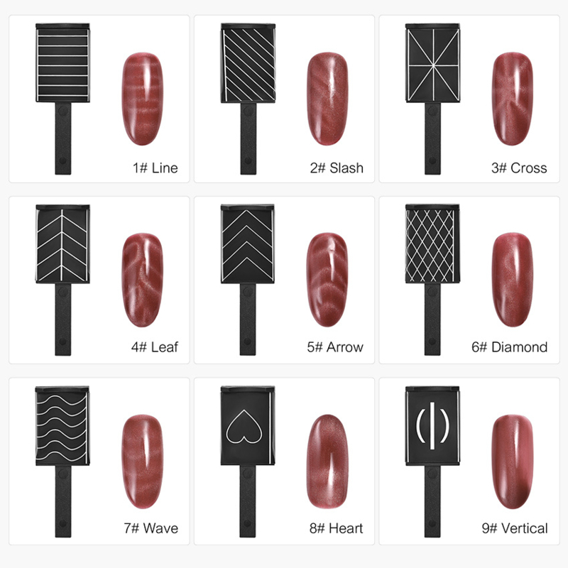 Met deze set van 9 magneten maak je 9 verschillende soorten lijnen en figuren in de nagels van de Cat Eye gel polish.