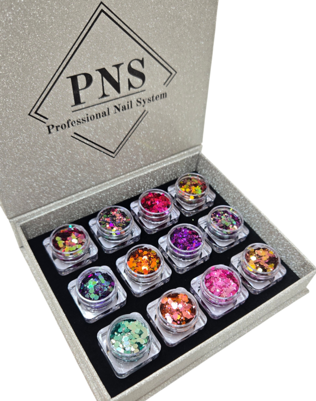 PNS Glitter 12Soort: Mix glitter van verschillende maten glitters 0.2mm | 0.4mm | 1mm